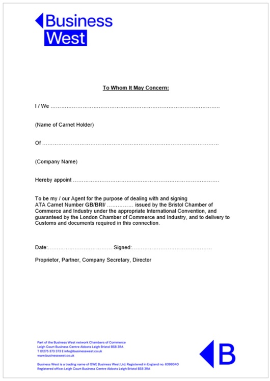 The ‘To Whom’ letter is attached to the front cover of the Carnet. It must be signed by the Director of the holder company (i.e. the same person who signs in Box J on the front cover).