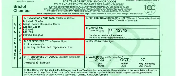 Box A on the front cover of the ATA Carnet should detail holder information, including: