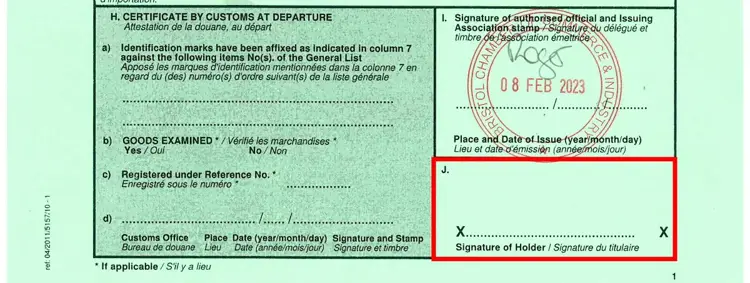 Box J on the front cover of the Carnet must be signed before the Carnet can be used. Only the Director of the holder company should sign in Box J.